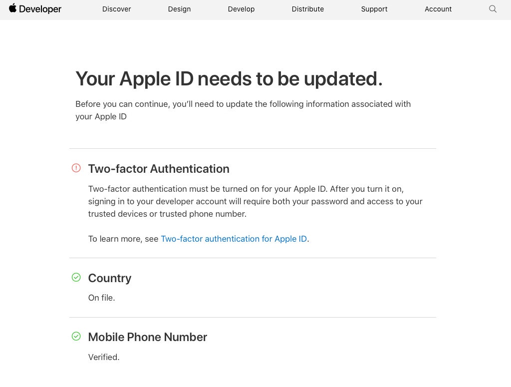 - Двухфакторная аутентификация включена! Продолжайте дальнейшую регистрацию. После того, как Apple подтвердит Ваш платеж, Вам должны быть предоставлены необходимые доступы.