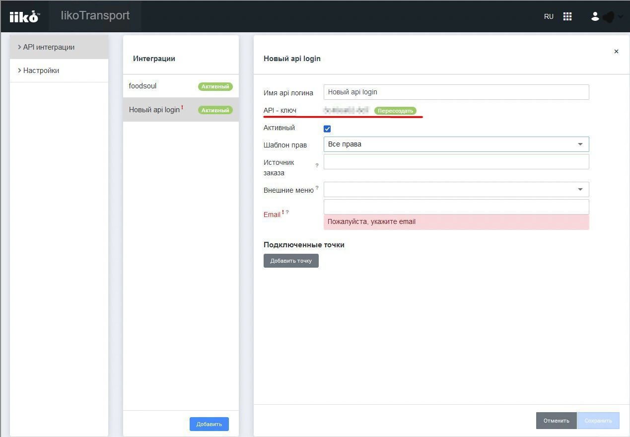 Для роботи з iikoTransport в айко необхідно додати інтеграцію, і вказати для неї API Логін, при цьому Айко автоматично згенерує API Ключ